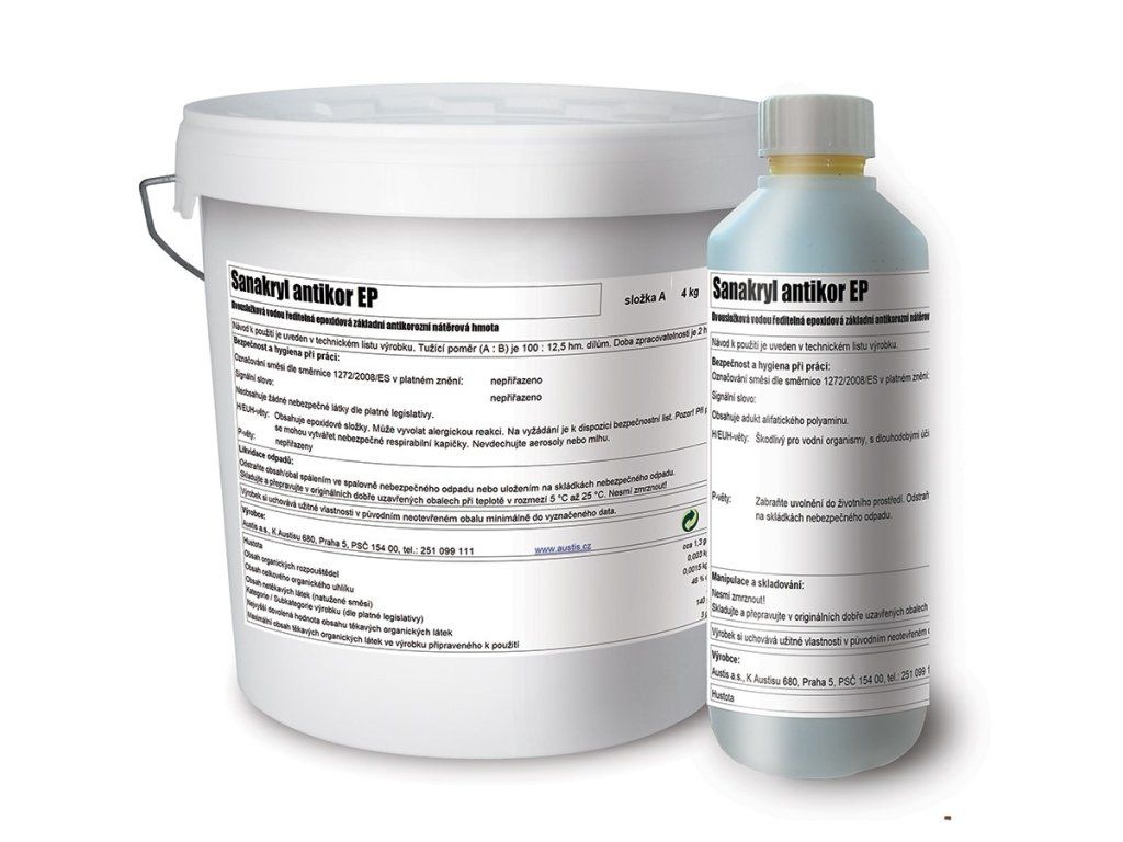 je dvojzložková vodou riediteľná náterová hmota pripravená z vodnej disperzie epoxidovej živice, vodou riediteľného aminického tvrdidla, špeciálnych antikoróznych a farebných pigmentov, plnív a špeciálnych aditív, upravujúcich jej vlastnosti. Nátery sa vyznačujú vynikajúcou adhéziou, výbornou koróznou achemickou odolnosťou a povrchovou tvrdosťou. Oblasť použitia Dvojzložková náterová hmota SANAKRYL antikor EP je určená pre základné nátery kovových konštrukcií a dielcov v kovopriemysle, v zlievarenskom a strojárenskom priemysle. Je vhodný najmä do prostredia s vysokým koróznym namáhaním. Doba spracovateľnosti natúženej zmesi je 2-3 hodiny. V prípade potreby urýchlenia preschnutia je možné film prisúšať pri teplotách 30 ° C - 60 ° C. Ako vrchný náter môže byť použitý SANAKRYL mat PROFI, SANAKRYL lesk PROFIa najmä SANAKRYL 2K PUR. V interiéroch ho je možné použiť aj pre jednovrstvové nátery (jednošichtovka).Dodatočné parametre
