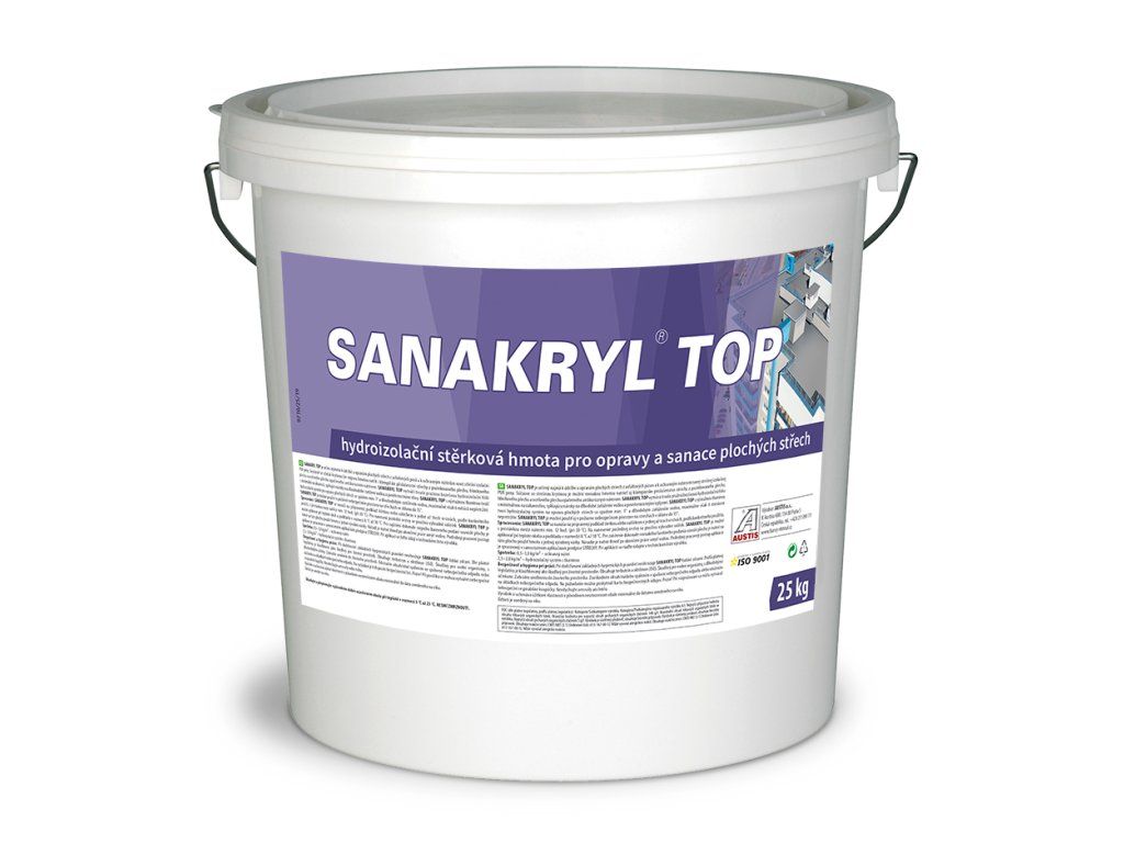 hydroizolačná stierková hmota určená na ochranu, opravy a sanácie plochých striech z asfaltových pásov a strešnej izolačnej PUR peny Spôsoby nanášania Oblasť použitia SANAKRYL TOP je možné použiť aj k ochranným náterom novej strešnej izolácie z PUR peny. Súčasne s náterom strešnej krytiny je možné SANAKRYL TOP použiť aj k náteru klampiarskeho príslušenstva strechy z pozinkovaného plechu, hliníkového plechu a oceľového plechu natretého antikoróznym náterom. Je určený aj na údržbu a opravu fóliových krytín. Hydroizolačná hmota SANAKRYL TOP sa nanáša v tekutom stave a po zaschnutí vytvára samostatnú trvale pružnú bezšvovú hydroizolačnú fóliu s minimálnou nasiakavosťou, spĺňajúcu nároky na dlhodobé zaťaženie vodou a poveternostnými vplyvmi. SANAKRYL TOP spolu s výstužnou tkaninou tvorí hydroizolačný systém pre opravu plochých striech so spádom min. 1 ° a dlhodobým zaťažením vodou, maximálne však 6 mesiacov nepretržite bez vyschnutia. V tomto systéme je SANAKRYL TOP určený ako základná kotviaca aj ako finálna uzatváracia vrstva. Tento systém sa používa na ochranu, údržbu a opravu starších strešných krytín z asfaltových pásov. SANAKRYL TOP je možné použiť na strechách v sklone do 15 ° aj požiarne nebezpečnom priestore. Spracovanie SANAKRYL TOP sa nanáša na podklad očistený od mechanických nečistôt a odmastený (odporúča vysokotlakové umývacie zariadenie a roztok saponátu) vyspravený, suchý. Savé podklady a starú asfaltovú krytinu je potrebné penetrovať prostriedkom FORTE penetral pri teplote podkladu a okolia v rozpätí 8-30 ° C. Nanáša sa v 1-3 vrstvách podľa druhu úpravy, s technologickou prestávkou 12 hod. Pri teplote 20 ° C. Posledná vrstva sa vykonáva len valčekom. SANAKRYL TOP je určený pre strechy s minimálnym spádom 1 ° a s dlhodobým zaťažením vodou, najdlhšie však 6 mesiacov nepretržite bez vyschnutia. Podrobný pracovný postup aplikácie je spracovaný v samostatnom aplikačnom predpise STRECHY. Aplikačným firmám do poručujeme zúčastniť sa odborného školenia za účelom získania "Osvedčenia výrobcu", oprávňujúce vyškolenú firmu na aplikáciu uvedenej hmoty. Zoznam osôb oprávnených na vykonávanie školení v SR dostanete v obchodnom odd. výrobcu. Dlhodobé záruky poskytuje výrobca len po absolvovaní odborného školenia. Získané osvedčenie umožňuje tiež bezplatné využívanie poradenskej služby a technického posúdenia stavu objektov pri väčších akciách. Zaujíma vás aplikačné video? Môžete si ho pozrieť tu. Zaujíma Vás ako na renováciu plechovej strešnej krytiny? Môžete sa pozrieť tu. Spotreba ochranný náter 0,5-1,0 kg / m2 hydroizolačný systém s tkaninou 2,5 - 3,0 kg / m2 PUR pena 1 kg / m2 Balenie 25 kgDodatočné parametre